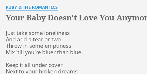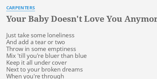 New fathers often feel a little left out when the baby needs so much attention. And theres nothing that you can do. Maybe hes feeling insecure about your love too. Your baby doesnt love you anymore You try to make believe It doesnt bother you For your own sake believe Youll make it through Just make a vow evry morning That today you will change Your point of view But its all a game That you play in vain And you live in pain Cuz its very plain. New fathers often feel a little left out when the baby needs so much attention. When your baby doesnt love you any more. Your Baby Doesnt Love You Anymore Lyrics by Carpenters from the Carpenters Gold album - including song video artist biography translations and more. From Voice Of The HeartRichard CarpenterOriginally recorded by Ruby and the Romantics in 1965 this obscure song caught my ear when submitted to us in 198. Can be used as content for research and analysis.